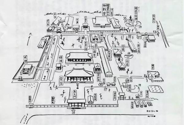 唐招提寺的整体规划依照传统中式寺院的中轴线延伸及东西对称的模式,但根据地形和原有建筑布局有所调整,从这张手绘图可以感受到并非严谨的对称模式: