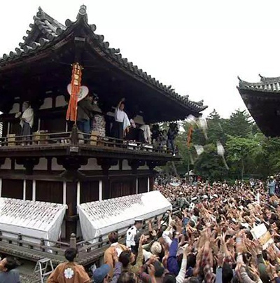 鼓楼还有一项传统:每年5月19日的“撒团扇”。起源是镰仓时代的觉盛上人,“宁被蚊子叮咬也不肯杀生”,于是弟子们在大师圆寂后,想出了在其灵位供奉团扇的方法。此后每年大师的忌日,便沿袭成为“撒团扇”的传统活动。