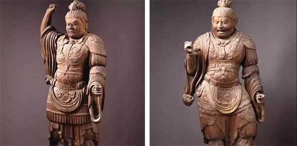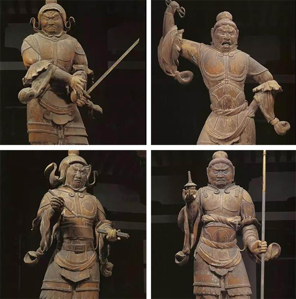 四大天王像,分列两边,均为木刻,真人大小,生动活现。与明清类似造像比较,身材更为矫健和人性化。原本的色彩因为年代久远已经脱落,露出了木的本色,反而更添古趣。