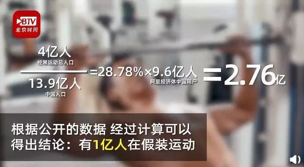 使用天猫《2019运动消费趋势报告》和国家统计局公开的数据测算,阿里经济体中国用户总量约为9.6亿人,有4亿人产生了与运动相关的消费,因此有4亿运动爱好者;根据上半年国家统计局发布的数据显示,到2019年中国有近4亿人经常参加体育锻炼,这4亿运动人口除以13.9亿总人口,那么实际运动人口比为28.78%;用28.78%乘以阿里巴巴经济体中国用户总数9.6亿人得出,有2.76亿阿里巴巴的用户经常参加体育锻炼。而这2.76亿与“4亿运动爱好者”之间有着1.24亿的差距,所以这1.24亿人就是“伪运动迷”,是“在假装健身”。