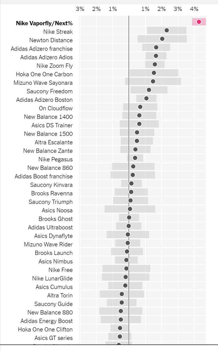 这双跑鞋究竟有多大效果?最近,美国《纽约时报》进行了一项大数据调查,发现相比穿其它正常跑鞋的跑者,穿着“破2”系列跑鞋的人能够快上4%到5%。