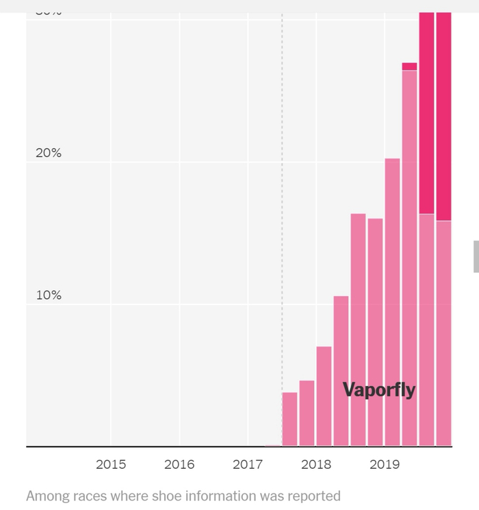 据保守统计,到2019年12月,已经有大约41%的高水平跑者(全马3小时以内)换上了“破2”系列跑鞋。