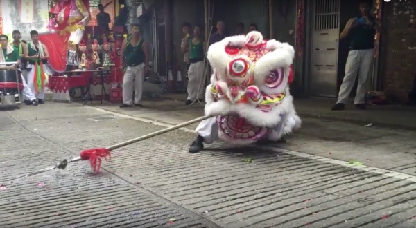 某年为恭贺哪咤太子宝诞,澳港柿山结义堂采青。采青是中国传统舞狮活动的一个固定环节,也是舞狮活动的高潮。 在舞狮过程中,“狮子”通过一系列的表演,猎取悬挂于高处或置于盆中的“利是”,因“利是”往往伴以青菜,故名“采青”。视频截图