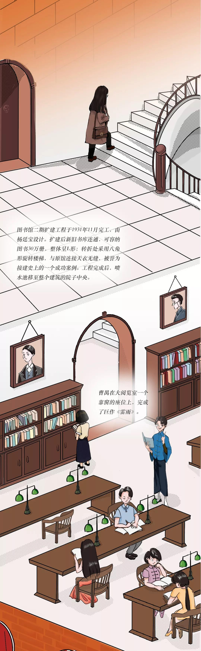 首先出炉的是关于老馆的手绘图,由宋昕阳、刘静茹、罗霁婉三人创作。她反复通读图书馆历史书籍和校友回忆录,和小伙伴们仔细斟酌后,挑选出十几个场景。最终的画面,质朴厚重,首先从清华二校门、大礼堂切入,由喷泉过渡到图书馆,馆内成排的书架、光洁的地板以及覆满爬山虎的外墙一一入画。长图还记录了上世纪30年代,受战争影响,清华南迁,图书馆成为战地医院的场景,以及抗战胜利后重新开馆的历史。