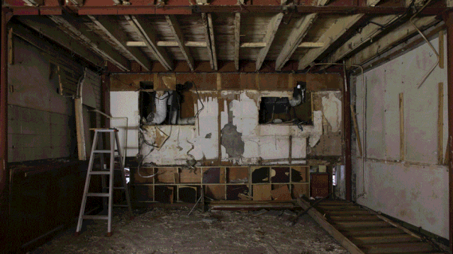 原本从外观看起来,这里的建筑除了陈旧一些,并不会给人”不安全“的感觉。但是拆除表面装饰之后,从一些钢结构残留判断,原有建筑已经历过至少2次改造,两侧墙体的砖墙大面积破碎,一些重要部分的混凝土梁也有露筋和断裂的情况,还有一些与周围居住空间的隔断木板也都有不同程度的破损。