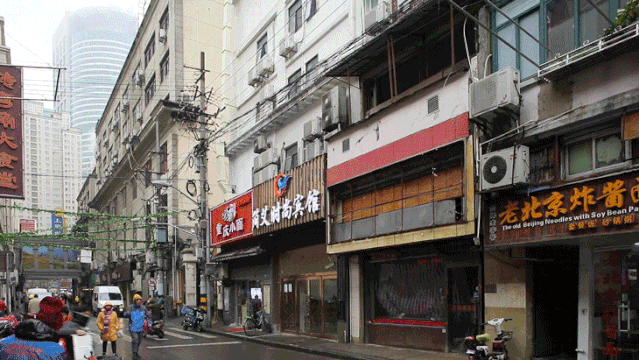 沿着贵州路,从厦门路、北京东路,一直走到宁波路、浙江路,走到贵州路109号的时候,看到这个地方当时是一个停业已有一阵子的叫做蝶梦的小饭店,周边氛围与之前去到的内部社区弄堂很不同。这里已经紧邻南京东路步行街,人流量比较大,周围的沿街商业很多,但是街道空间陈旧,街区环境有些凌乱。