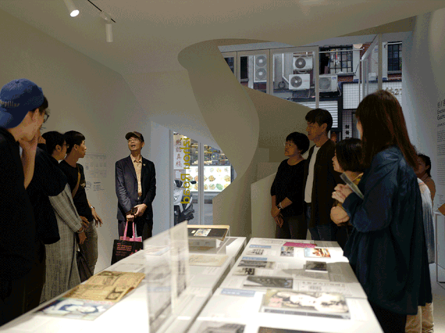 在进入109号空间的时候,由楼梯栏板的弧面和楼梯底部腾空的斜面所构成入口空间,为这个层高非常有限的室内拉开了一个超大画幅的景象,当人沿着楼梯盘桓而上,能够感受到丰富的场景和空间变化——从热闹的街道到安静的室内,从一楼开阔的展厅到二楼内向的讲座/放映厅,再从二楼可以坐下休息的台阶到三楼面向街道彻敞的阳台,这些变化的场景和连续的空间构成了一个能够容纳和交汇多种文化活动可能性的场所。