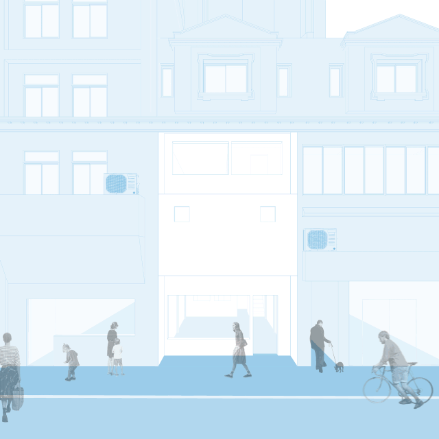在立面的处理上,109号的外观是极简而通透的,试图让一个内凹空间被呈现出来,内部的光线和空间能够直接面向街道,构成一个有空间深度的立面。内部空间一共有三层,用一个以椭圆形两轴逐渐等差放大的旋转楼梯将三层楼的空间联系起来。