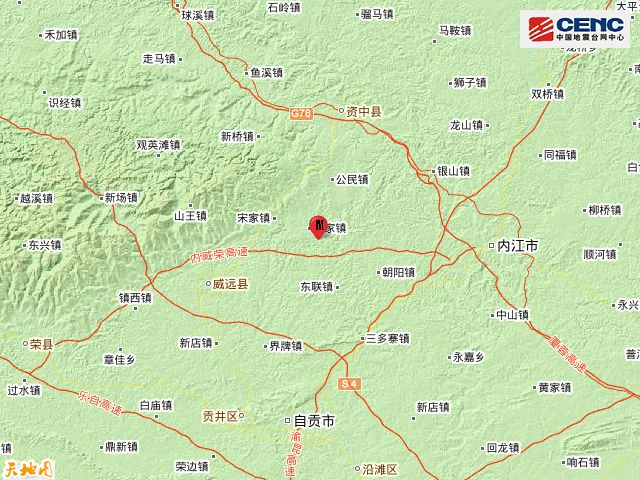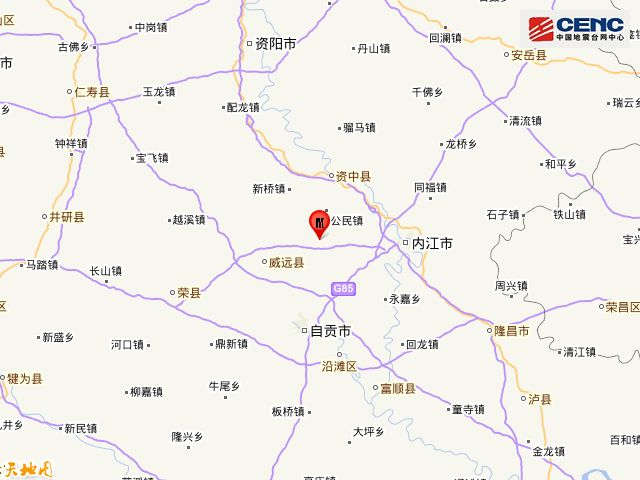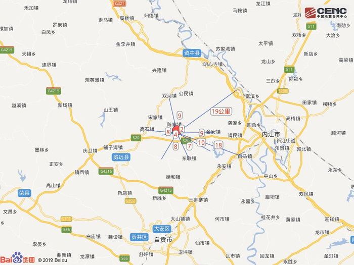 周边县城:震中距威远县16公里、距资中县20公里、距市中区24公里、距东兴区25公里、距大安区26公里,距内江市23公里,距成都市138公里。