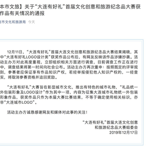 17日,大连市文化和旅游局发布消息称,将立即组织相关方面进行调查,目前调查工作正在进行中,调查结果将第一时间向社会公布。活动主办方再次重申,按照既定的评审规则,参赛者应保证享有作品知识产权,若经举报侵犯他人知识产权的,一经查实,将取消参赛资格并追回奖励。