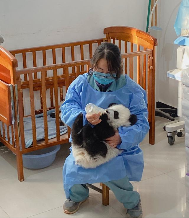 俞昊娜冲好奶粉,把熊猫宝宝搂在怀里,端着奶瓶像哄孩子般喂奶。“每天要进行三到四次‘还崽’,把熊猫幼崽‘还’给熊猫妈妈,主要是让幼崽吃到母乳,此外我们也要进行人工辅助喂奶。”和俞昊娜一同担任保育员的王娜介绍。