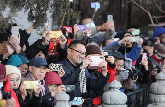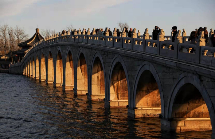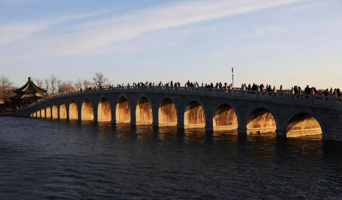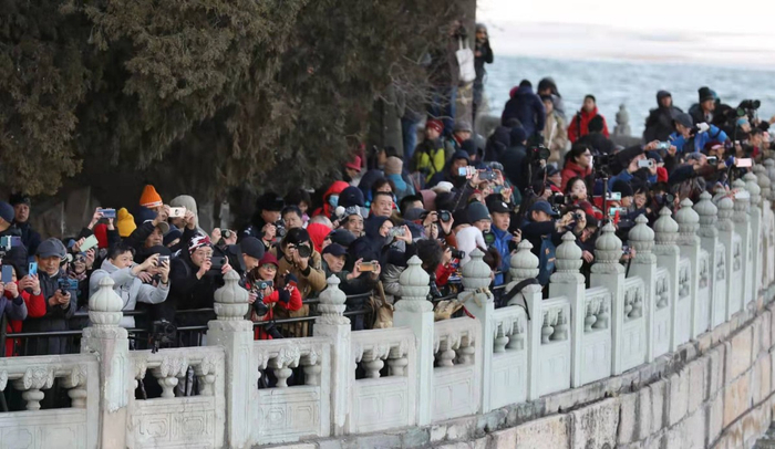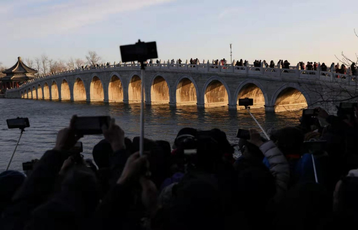 工作人员表示,近期前来拍摄“金光穿洞”的游客众多,尤其冬至节气临近,颐和园的十七孔桥与南湖岛游客呈持续上升趋势,落日前的高峰时段,该区域游客近700人。