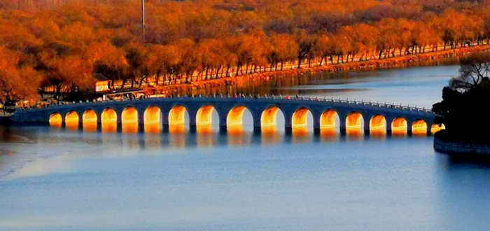 每年冬至前后,落日的余晖恰好照射在颐和园十七孔桥所有桥洞的侧壁上,金灿灿的夕阳点亮桥洞,远远看去就像桥洞内点满了明灯,人们把这种现象称作“金光穿洞”。