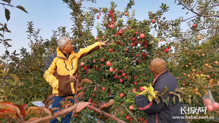 孙建设教授(左)为果农讲解苹果采摘管理技术 长城新媒体记者马宁/摄