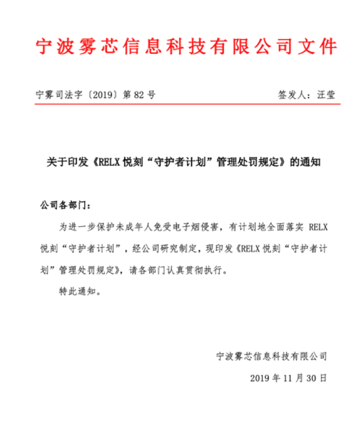 悦刻CEO汪莹告诉记者,悦刻也设立独立督查组,通过主动巡查和接受检举等方式发现和查处违反RELX 悦刻“守护者计划”的行为,由她本人担任督查组组长,负责调查商业合作伙伴违规行为,处理申诉,进行处罚与追责。