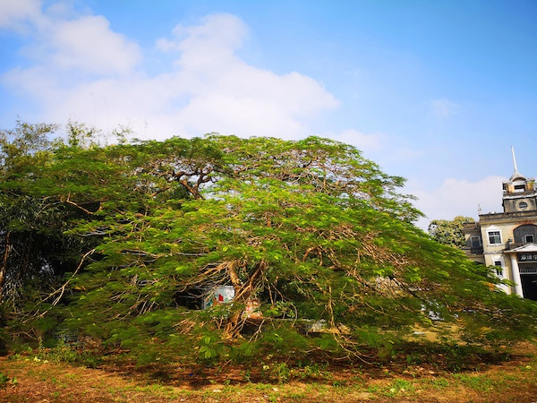 校园内最显眼的当然是两棵巨大的凤凰树,其中一棵更因枝叶过于繁茂,延伸至地上,宛若一座大帐篷。从枝叶间钻到树下,举头便是树冠构成的天幕,十分有趣。当年在此上学的孩童,少不了钻进来玩吧?若是凤凰花开时,这里必然是网红地。