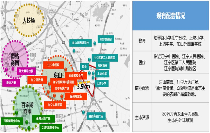 青龙山国际生态新城规划自建约70万方商业、景观区,业态涵括住宅、五星级酒店、写字楼、公寓等类型,荟萃旗舰型商务。同时,由于地处东山副城,还享受南京南站、百家湖、江宁东山等商圈的配套辐射。