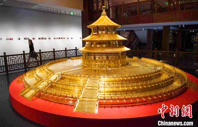 现场展出的柚木贴金制成的天坛祈年殿模型作品 崔楠 摄