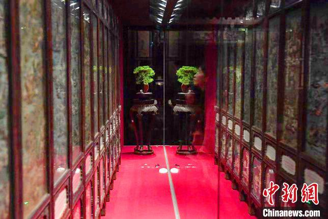 正在展出的故宫馆藏紫檀嵌银丝边广西府州图染牙雕刻围屏 崔楠 摄