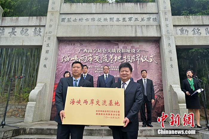 12月18日,广西昆仑关战役旧址设立海峡两岸交流基地授牌仪式在南宁举行。国台办副主任龙明彪(右)代表中央台办、国务院台办授予南宁昆仑关战役旧址“海峡两岸交流基地”牌匾,南宁市副市长李建文代表南宁市接牌。 中新社记者 俞靖 摄