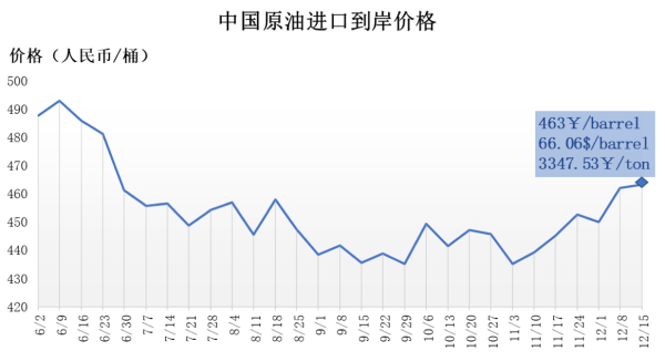 当天发布的最新数据显示,12月9日-15日,中国原油综合进口到岸价格为463元/桶,较前一周上涨2元/桶,涨幅0.27%。分品类来看,中国轻质原油进口到岸价格为462元/桶,较前一周下跌1.47%;中国中质原油进口到岸价格为470元/桶,较前一周上涨2.10%;中国重质原油进口到岸价格为420元/桶,较前一周下跌2.79%。