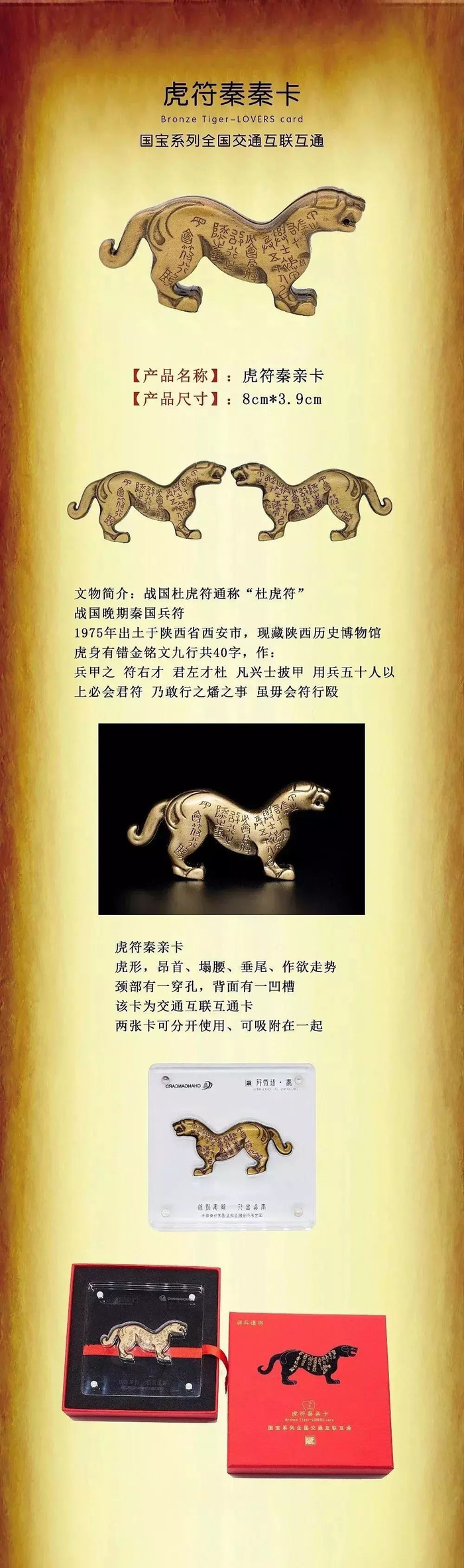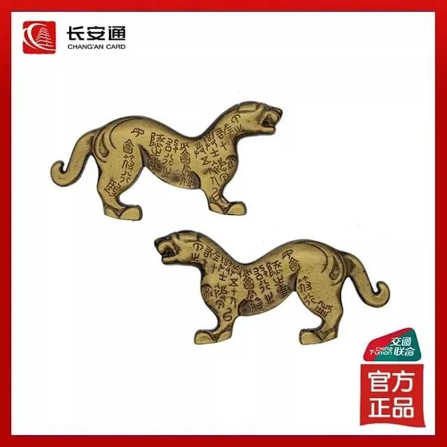 长安通虎符卡按文物原型,以仿青铜质感打造而成,杜虎符卡同样分为左右两部分,且两半均为可独立使用的互联互通卡,虎符在手,通行九州。造型精妙古朴的虎符卡令持卡者别具风采。