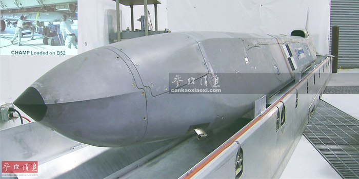 美空军已于2012年10月在本土的犹他州导弹测试靶场完成了CHAMP微波导弹的多次试飞,使用的载体为AGM-86C巡航导弹(最大射程1100千米),可由B-52轰炸机搭载,按美军计划,未来将在AGM-158隐身导弹上搭载CHAMP微波弹头,一次发射可沿规划航线摧毁100个敌方电子目标,小图为B-52搭载CHAMP导弹试验。