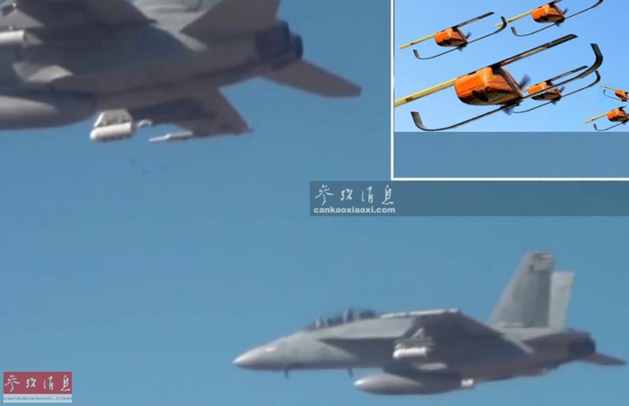 2016年10月,美海军3架F/A-18F战机组成编队同时释放103架“山鹑”微型无人机,小图为无人机特写。