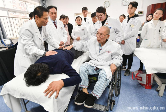 12月17日上午8时许,医生开始查房。在武汉大学中南医院骨科康复科病房,“白大褂”队伍里有一位年迈老人。他坐在轮椅上,行动靠年轻医生代劳。但一到了解患者病情,老人立马挺直腰板,听得格外仔细,边看片子边给出诊疗意见。