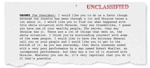 白宫发布的特朗普与乌克兰总统泽伦斯基通话文本,特朗普请求后者“帮个忙”,调查拜登及其子亨特和民主党全国委员会人员参与的一个可能的阴谋。