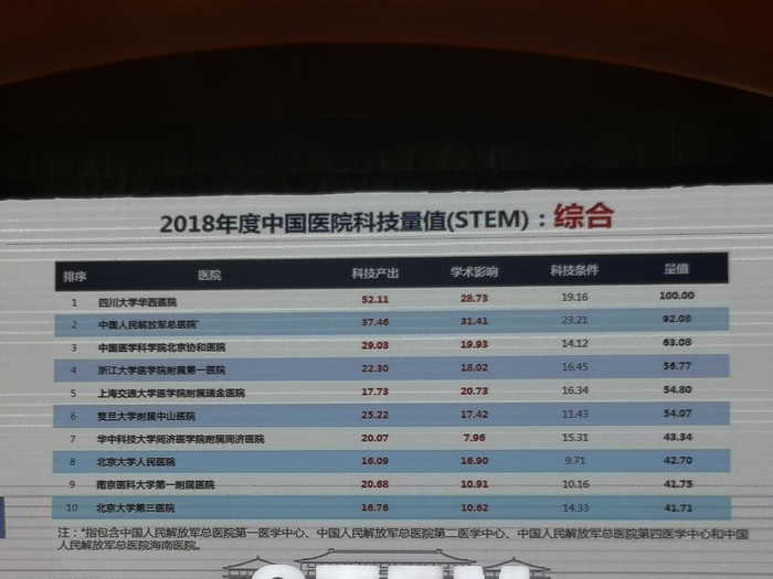 中国医学科学院院长、中国工程院副院长王辰院士现场发布《2018年度中国医院/中国医学院校科技量值研究报告》。综合结果显示:综合科技量值位居前100的医院分布在19个省份,北京、上海、广东分别有22家、18家、9家。按区域划分,东部、中部和西部地区分别有71家、15家和14家。位居前10的医院分别是四川大学华西医院、中国人民解放军总医院、中国医学科学院北京协和医院、浙江大学医学院附属第一医院、上海交通大学医学院附属瑞金医院、复旦大学附属中山医院、华中科技大学同济医学院附属同济医院、北京大学人民医院、南京医科大学第一附属医院和北京大学第三医院。