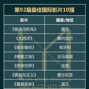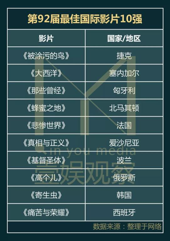 12月17日,第92届奥斯卡公布了包括“最佳国际影片”“最佳纪录长片”“最佳原创歌曲”“最佳真人短片”等9个类别的奖项初选名单。其中,最被国人所关注的当属“最佳国际影片”奖项。