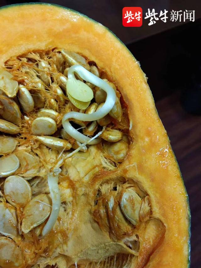 对此,丹阳市农业农村局相关人员表示,南瓜内种子发芽比较罕见,但南瓜品质不受影响,可以正常食用。