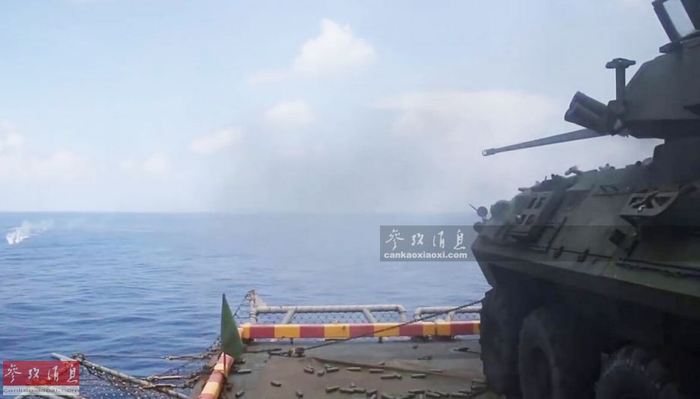 美军“黄蜂”号两栖攻击舰在南海航行期间,LAV-25轮式装甲车在甲板进行海上打靶动态图。