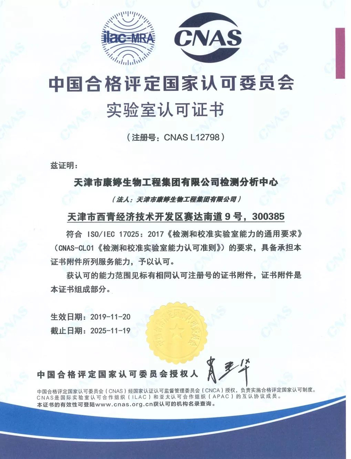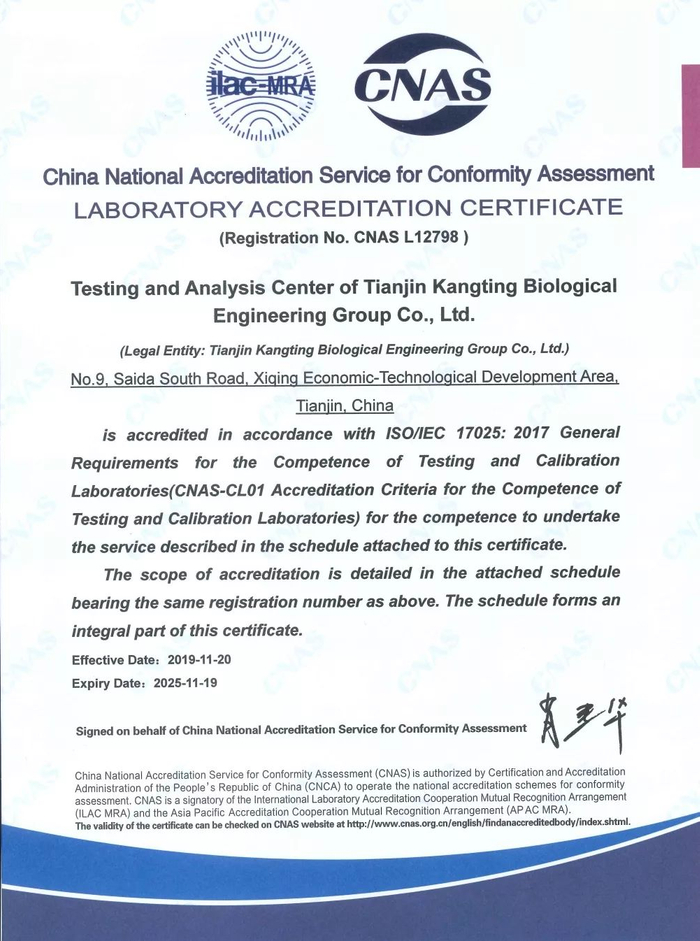 天津市康婷生物工程集团有限公司检测分析中心(以下简称“检测分析中心”),于2019年11月通过中国合格评定国家认可委员会(CNAS)认可,证书编号:CNAS L12798。这表明康婷集团检测分析中心具备了依据国际认可准则开展检测服务的技术能力,检测结果可以得到国内和国际上的承认,提高了社会公众和行业界的认知度和信任度。