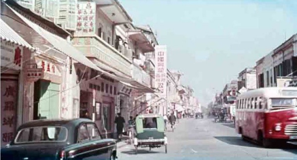 水坑尾街景色,远处已进入荷兰园。经过的一辆4号线公共巴士,是当时唯一的巡环线巴士,名为“小环市”。(1960年代)