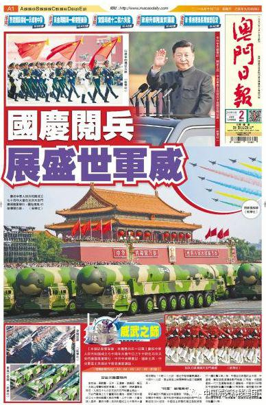 今年国庆期间,《澳门日报》大篇幅报道了国庆阅兵和群众游行,以《国庆阅兵展盛世军威》为题,重点介绍了首次公开亮相的东风-41核导弹、东风-17常规导弹等航天装备。
