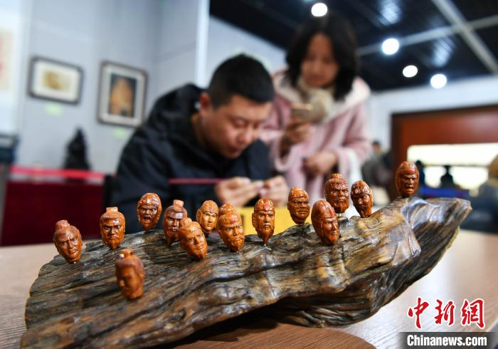 图为河北省传统工艺美术精品展展出的核雕作品《三国人像》。 翟羽佳 摄