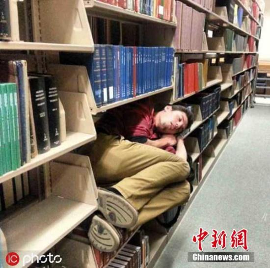 一位男士在图书馆的书架上睡觉。图片来源:东方IC 版权作品 请勿转载