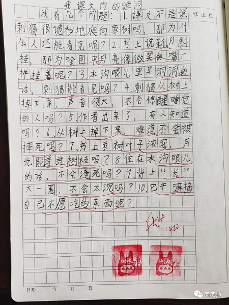 “我在微博上表达了质疑之后,收到了很多网友的评论和留言。欣慰的是,很多语文老师意识到了这个问题。”“瘦驼”告诉记者,令他印象最深刻是一名微博名称为“勋章菊”的老师。