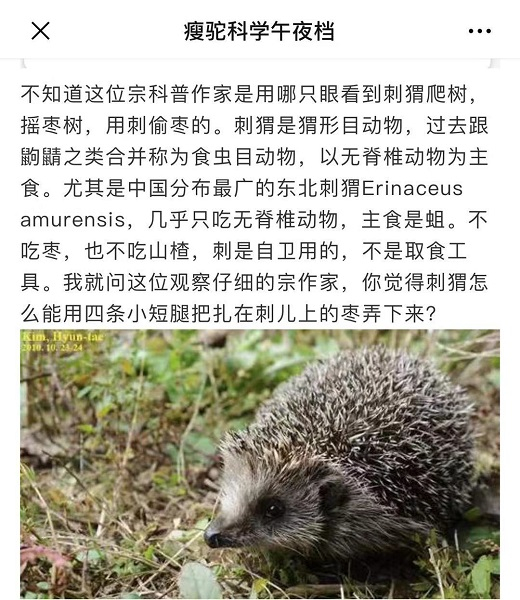 专家观点:刺猬背果子,和科学观察不符