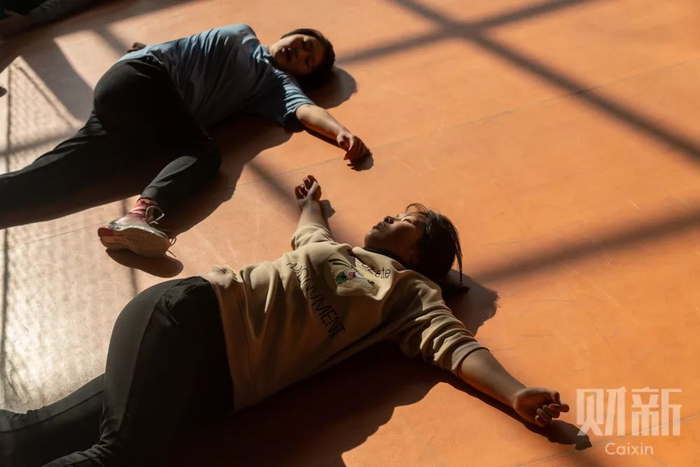 一个半小时的训练结束,两名队员躺在地板上做拉伸。