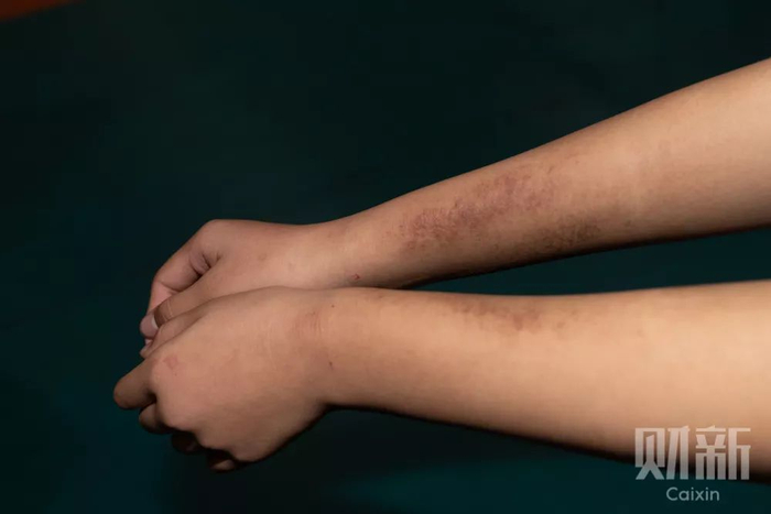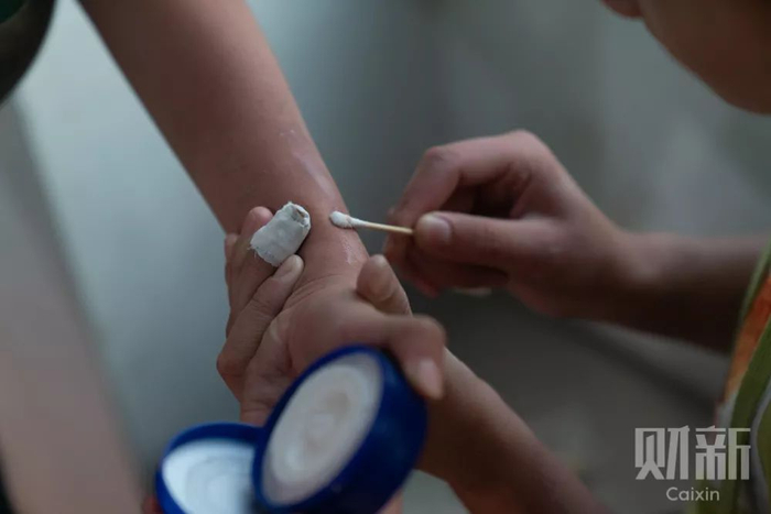 冬天,垫球的手臂皮肤经常痛痒,队友们互相上药。