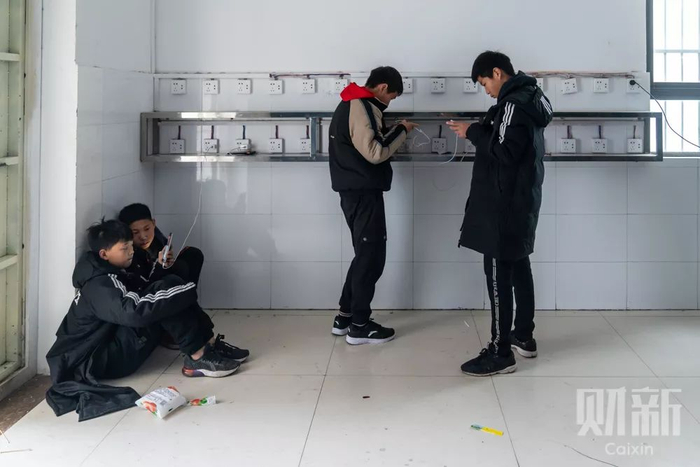 宿舍里停电后,体校学生们在楼梯口边充电边玩手机。