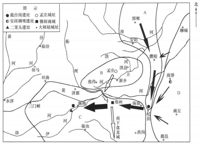 A、B、C、D分别代表漳河型、辉卫型、二里头文化和岳石文化的主要分布区