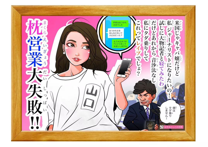 这张是伊藤事件后,有人在网上中伤她的讽刺漫画,说她“枕营业大失败”。