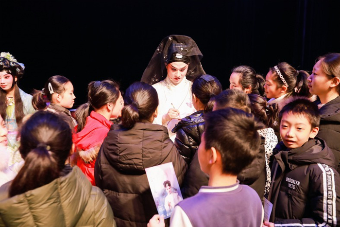 当昆曲《春江花月夜》散场,上戏戏曲学校2019年招收的“小昆班”孩子们冲到台上把张军老师团团围住,眼神中充满向往。就在刚刚结束的演出中,台上的演员中有不少这些孩子们“昆六班”的师兄师姐。这个舞台,让两代年轻的昆曲学生们都觉得美好,且又如此触手可及。