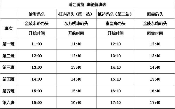 试运营的“浦江游览班轮航线”由金陵东路游船码头、秦皇岛路游船码头、东方明珠码头组成“黄金三角”,实行环形航线、定时定点、多点停靠、水景联动。航班间隔时间为1小时每班,11时至16时,金陵东路码头正点发船,一天6班。其中,金陵东路游船码头至东方明珠码头,东方明珠码头至秦皇岛路游船码头的水域游览时间为20分钟,秦皇岛路游船码头至金陵东路游船码头水域游览时间为30分钟。未来,班轮还计划在徐汇滨江、杨浦滨江国际时尚码头停靠。