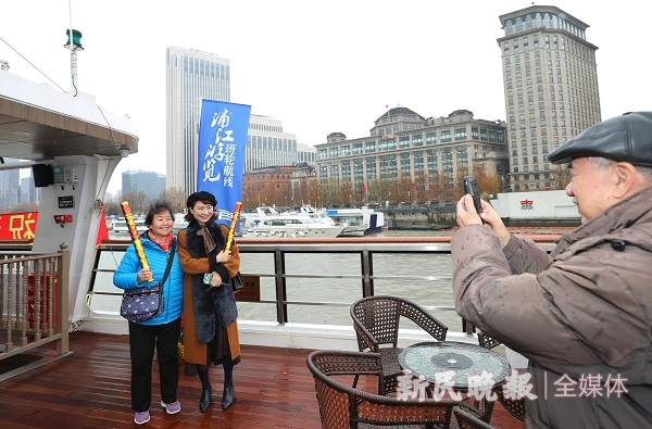 图说:游客在第一班浦江游览班轮上拍照留念  新民晚报记者 周馨 摄