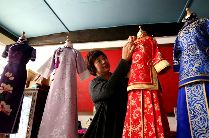旗袍是由清代旗女的袍服逐渐发展而来的,民国时期流行最盛,被誉为女性国服。发展至今,旗袍主要分为京派、海派以及港派等。张凤兰介绍,相比海派旗袍,京式旗袍具有宽边、重装饰、色彩华丽等特点,面料选用相对厚重的织锦缎,外形也更为挺阔宽松,体现的是典雅庄重、大家闺秀的气质形象。